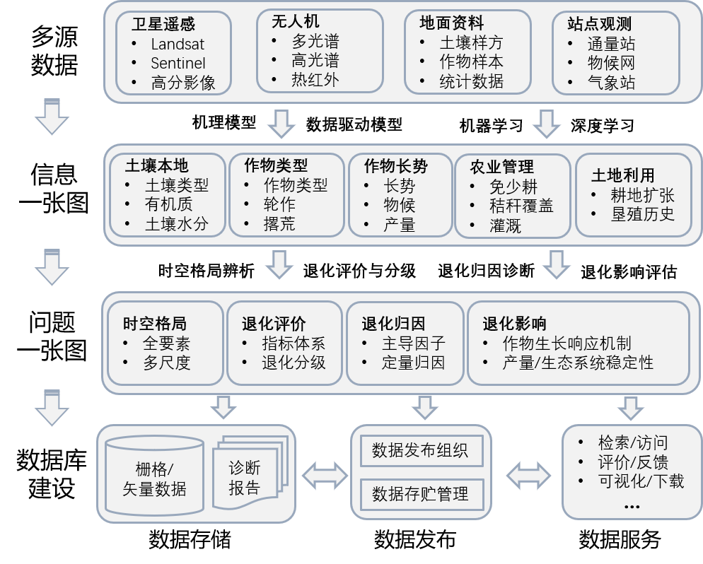针对我国东北黑土地数据资源分散存储、管理、服务,无法形成统一有效管理和共享服务合力的问题,课题拟在突破天空地一体化的多尺度黑土信息获取与多源感知技术的基础上,形成时空连续、物理特性一致的黑土信息一张图;建设黑土资源环境监测数据产品汇聚、存储、管理和共享平台;基于黑土地全要素数据库,构建黑土地资源分等定级指标体系、黑土地绿色农田标准指标体系,多尺度精确问诊土壤退化和农业生产等关键问题,形成黑土地问题诊断一张图。