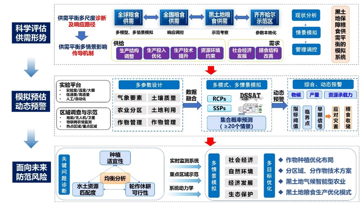 针对黑土地日益退化严重影响东北地区农业可持续发展和区域粮食安全这一重大问题,基于大样地调查、多源数据融合等多种手段,开展黑土地粮食安全多情景模拟与动态预警技术研发。重点研究:基于气候模式-作物模型-经济模型耦合开展国际、国内粮食安全系统评估,从供需平衡角度全面把握黑土地粮食供给能力;结合贝叶斯模型、马尔科夫链蒙特卡罗技术,研发多情景、多模式、多模型下的黑土地作物物候及产量集合概率模拟技术,综合预测黑土地区产粮能力和产量风险,结合极端气候事件研发精准化农业预警体系,辨识粮食安全预警指标阈值、临界点和早期预警信号;系统揭示黑土地作物物候和产量变化时空分异特征,结合作物种植适宜性,实现粮食生产区域优化布局,打造助力于粮食供需平衡的黑土地粮食生产优化模式。